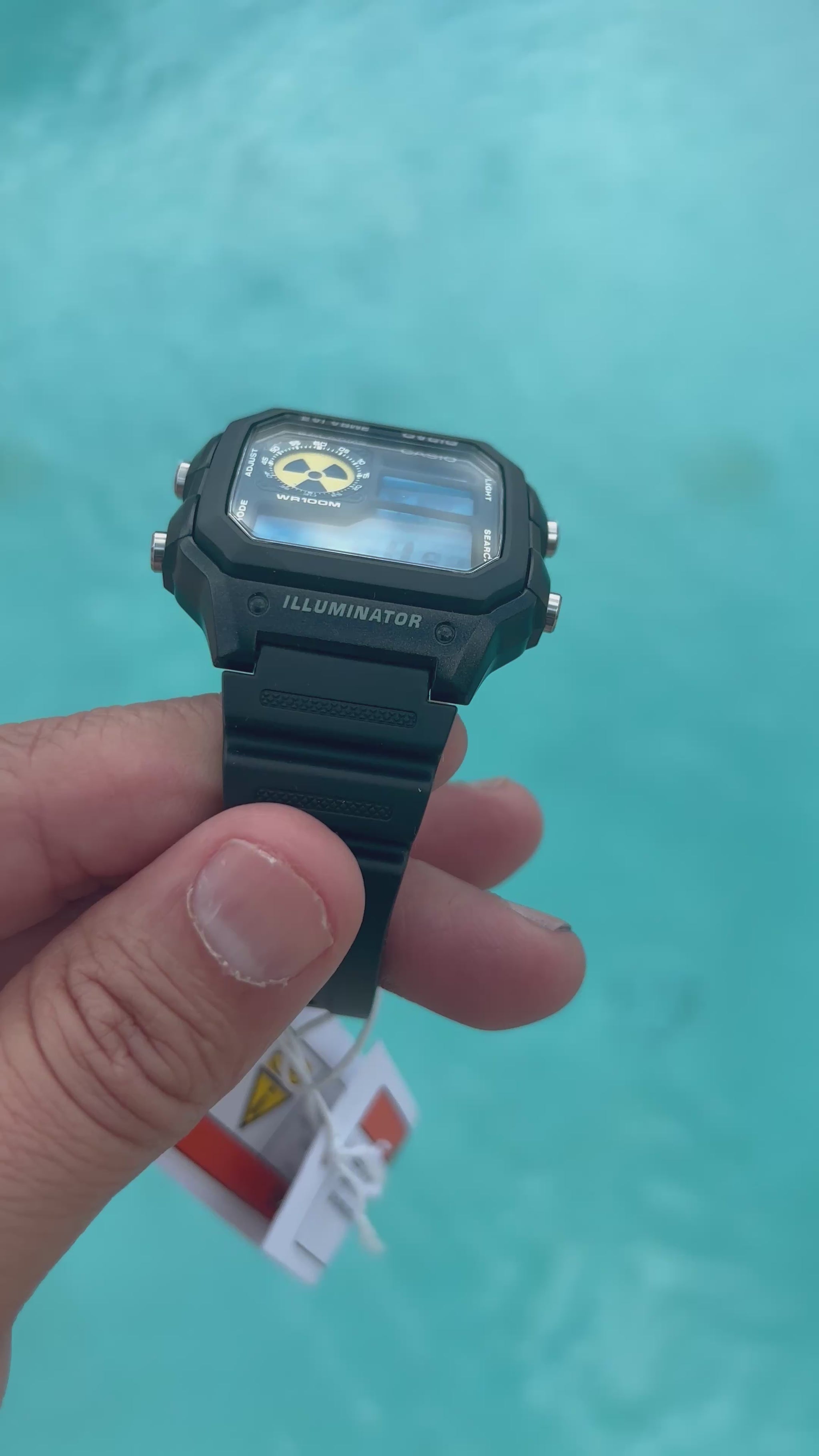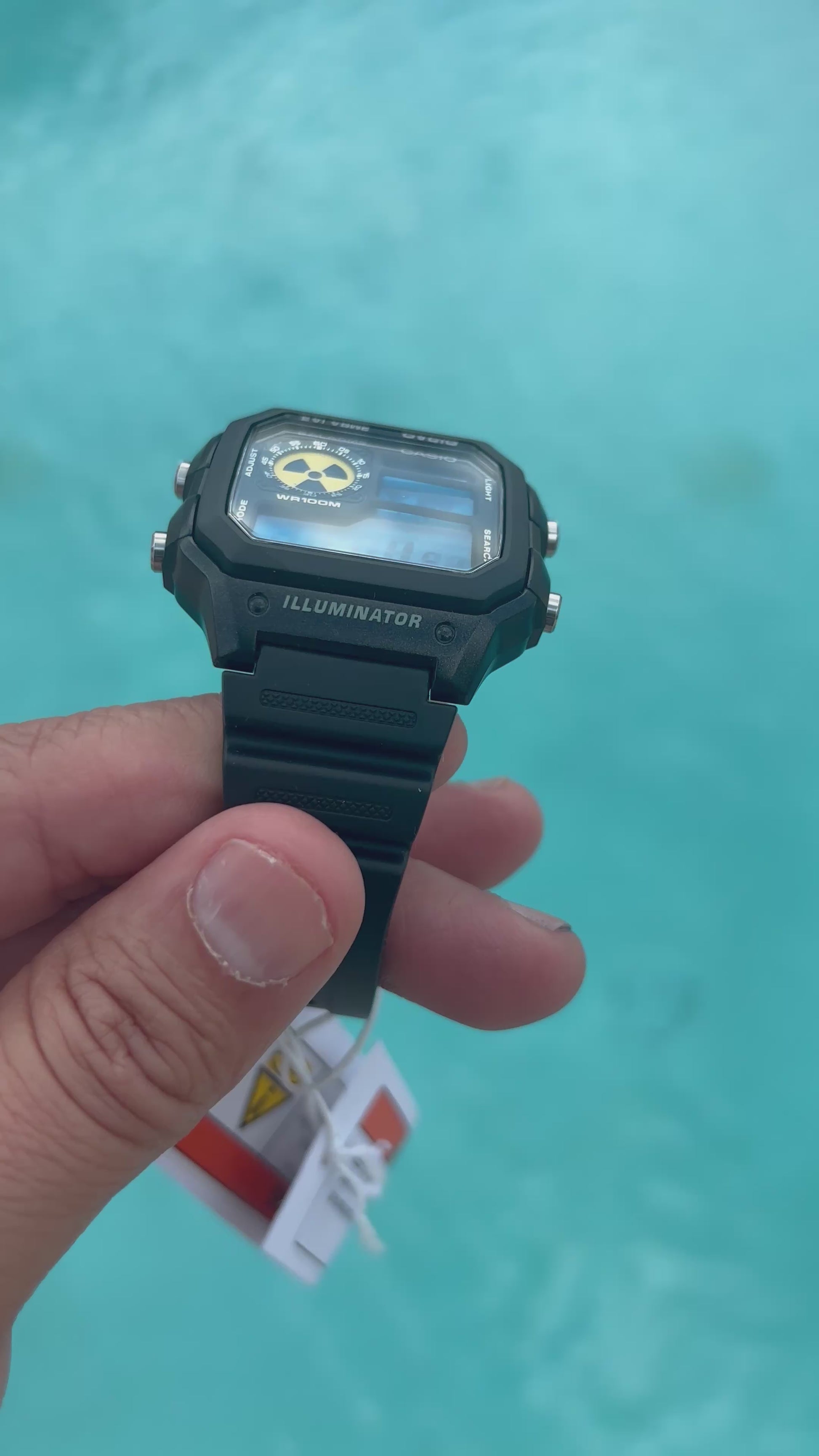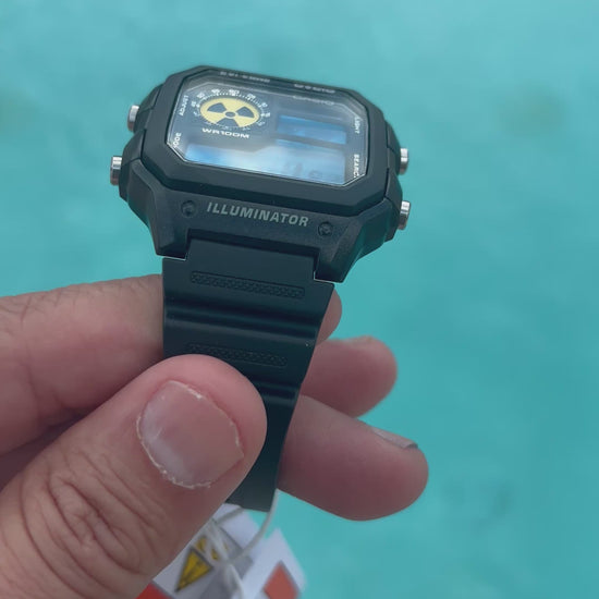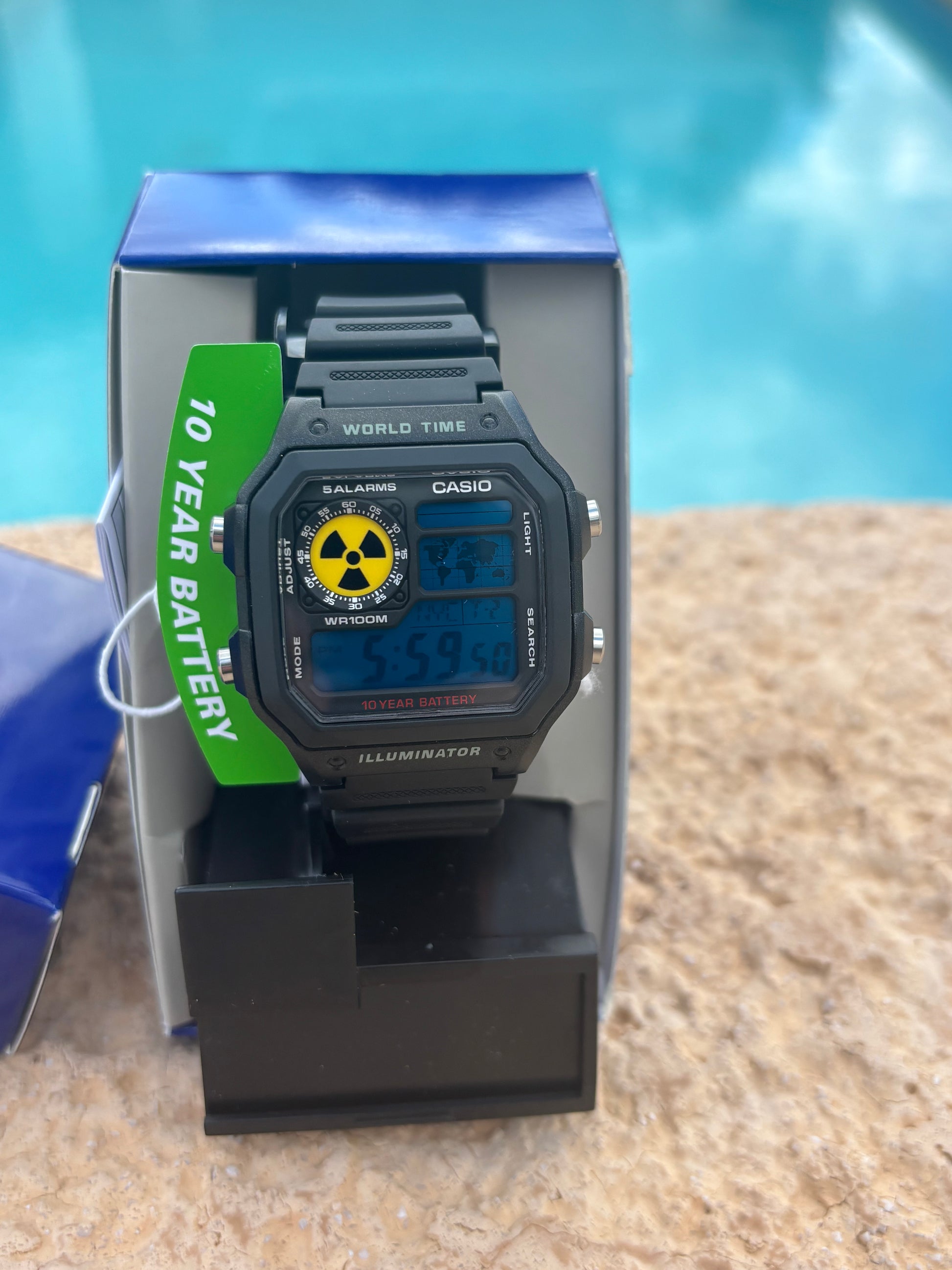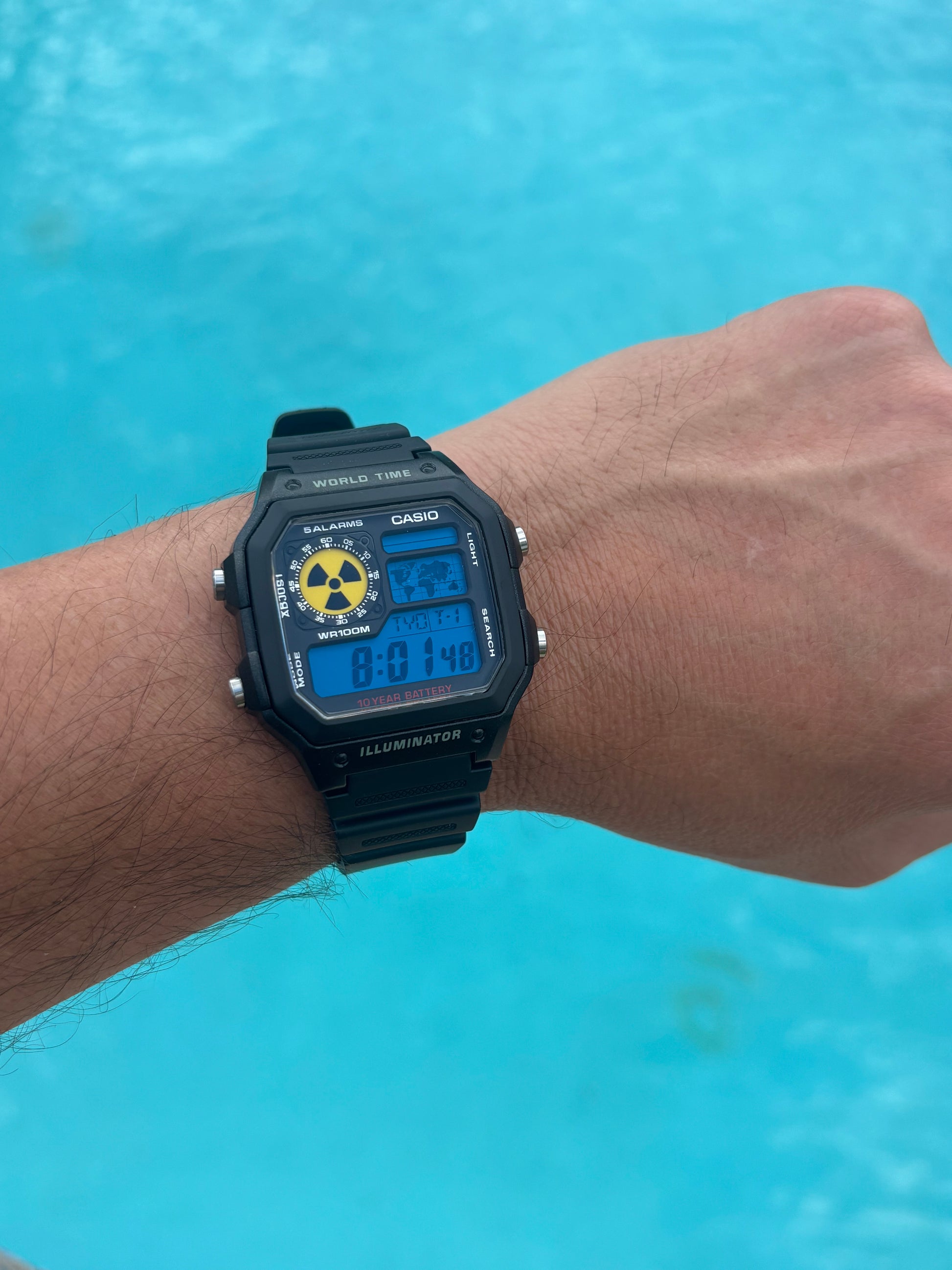 Stand out with this one-of-a-kind Casio AE1200 mod. Featuring a bold nuclear symbol emblem and striking blue gel filter, this retro digital classic transforms into a statement piece. Known as the “Casio Royale,” the AE1200 delivers world time, 5 alarms, stopwatch, countdown timer, and 100m water resistance.
