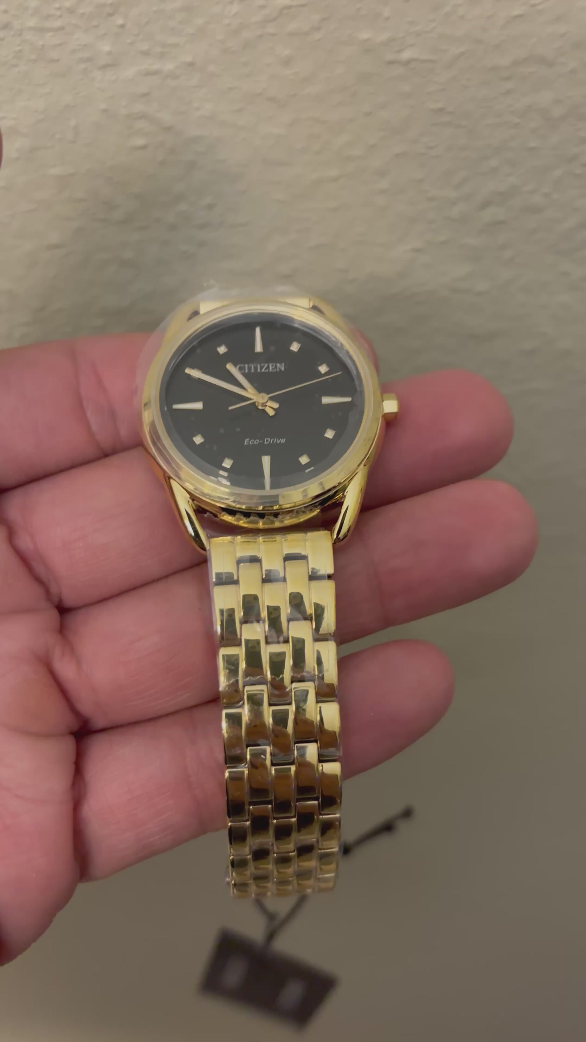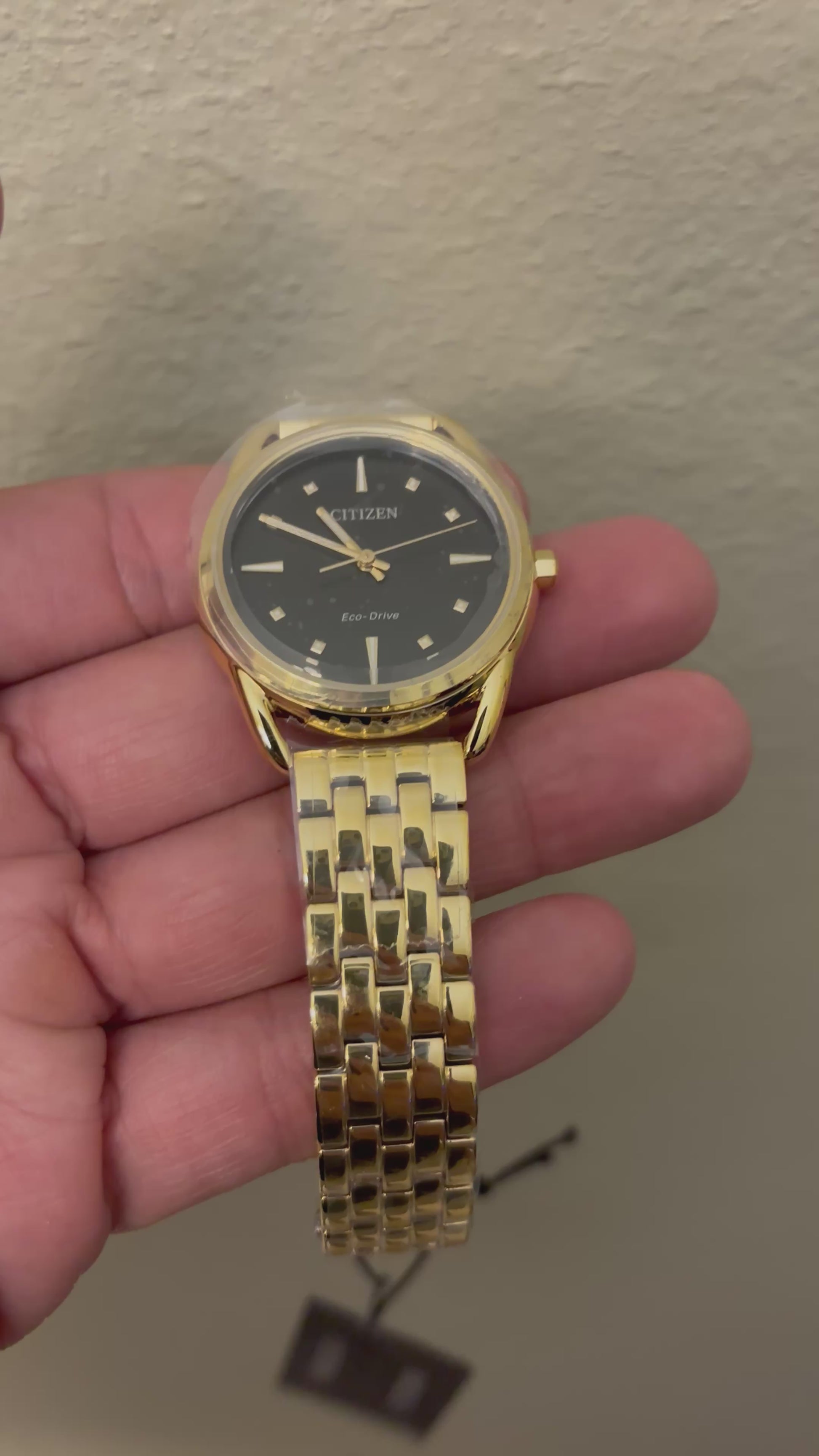 - Bracelet: Gold-tone stainless steel with fold-over clasp