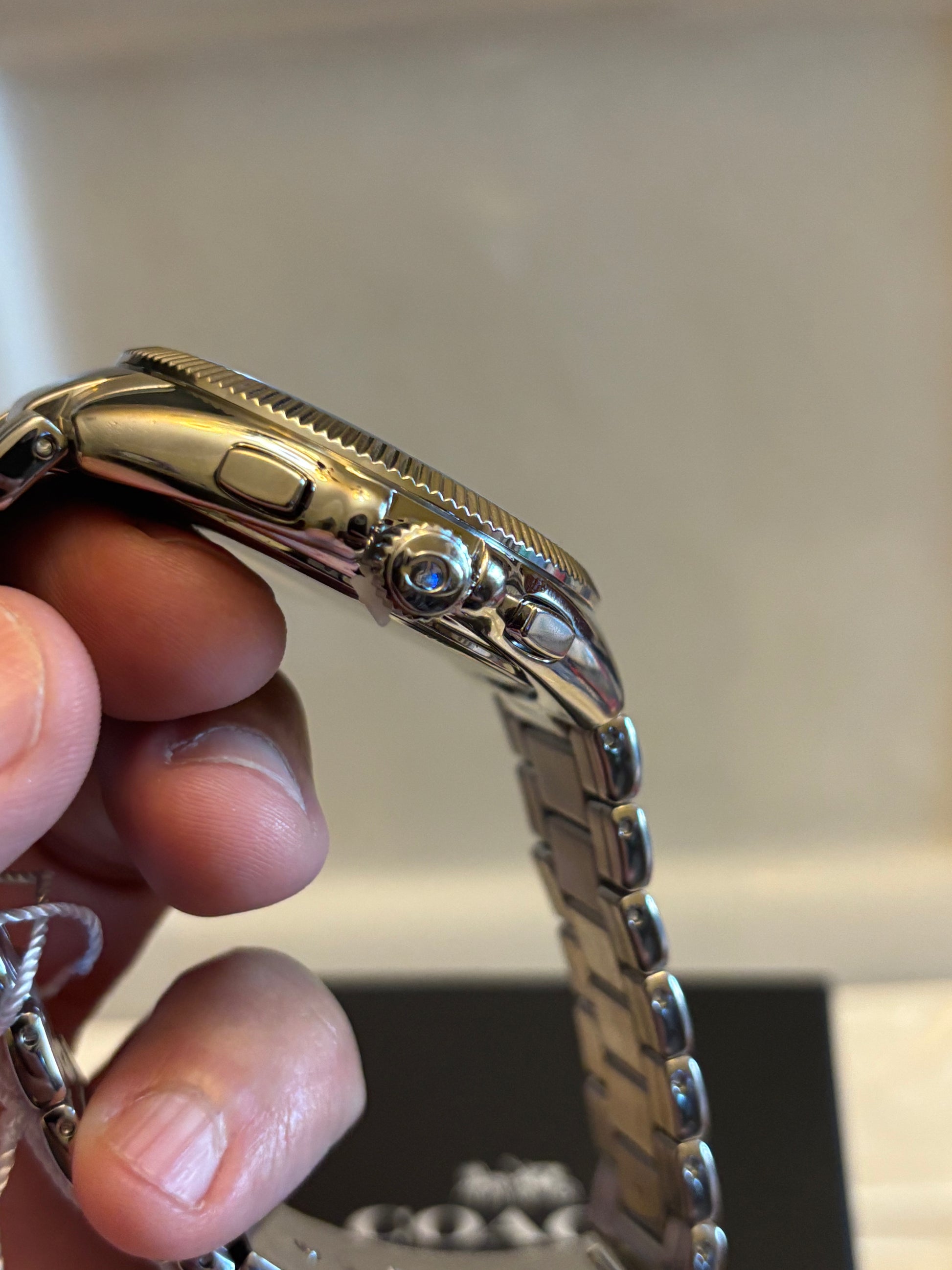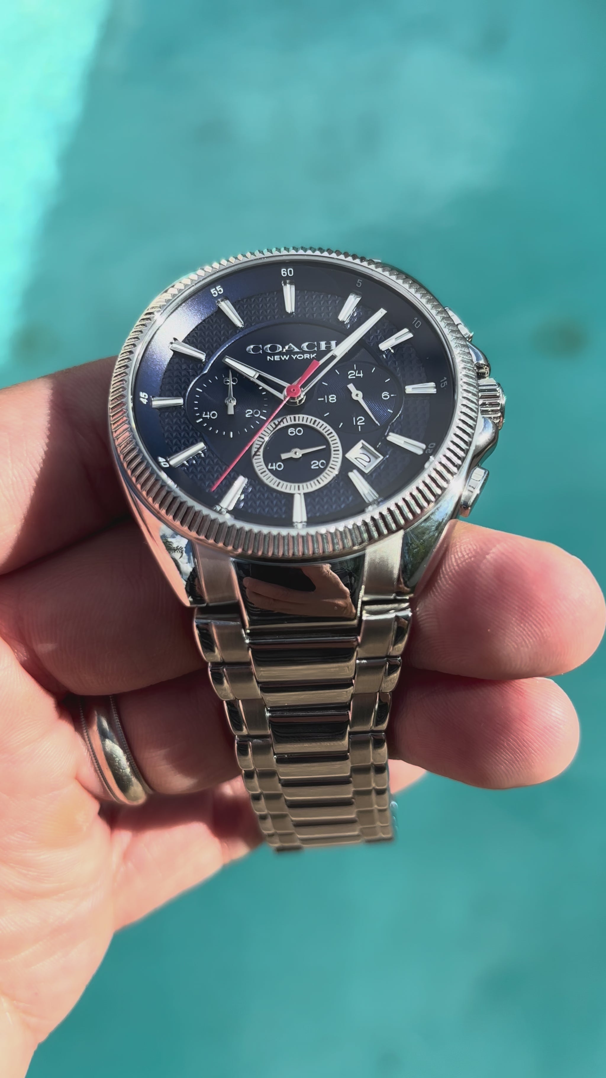 Refined New York style meets bold design with the Coach Chronograph 14602679. This men’s watch features a striking blue textured dial with chronograph sub-dials, luminous hands, and a stainless steel case and bracelet for a modern, versatile look.