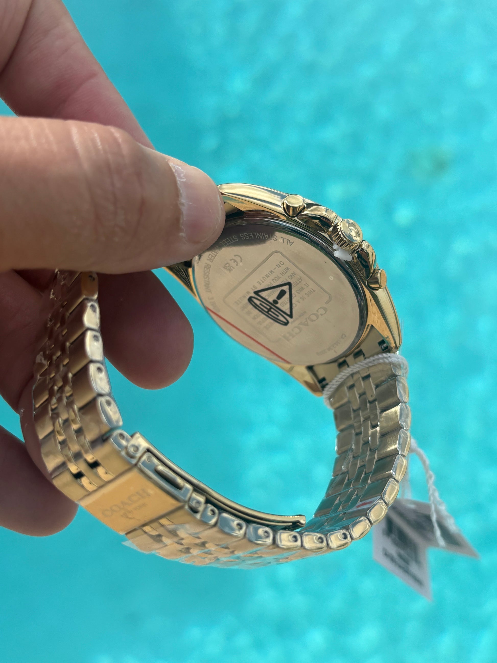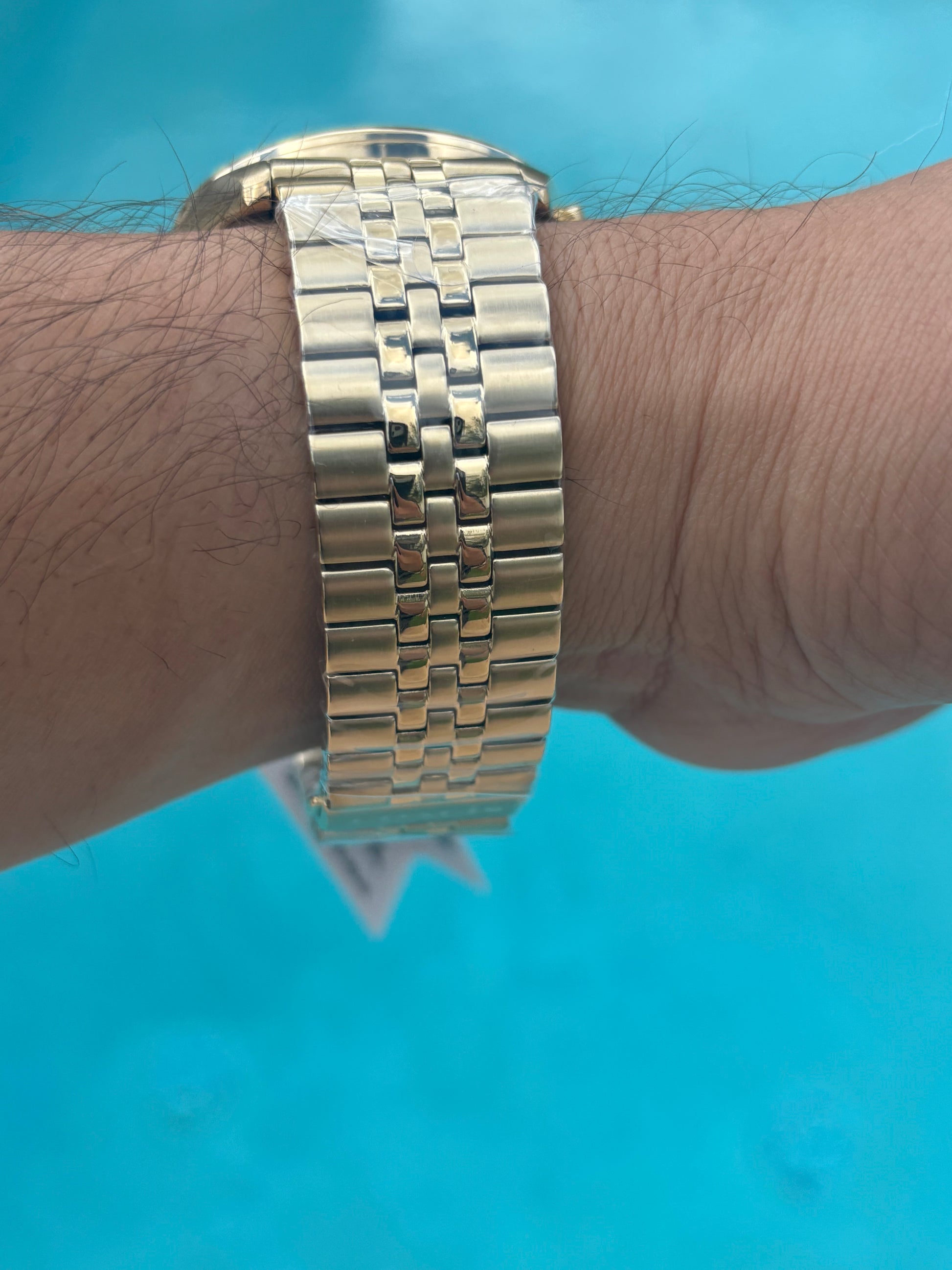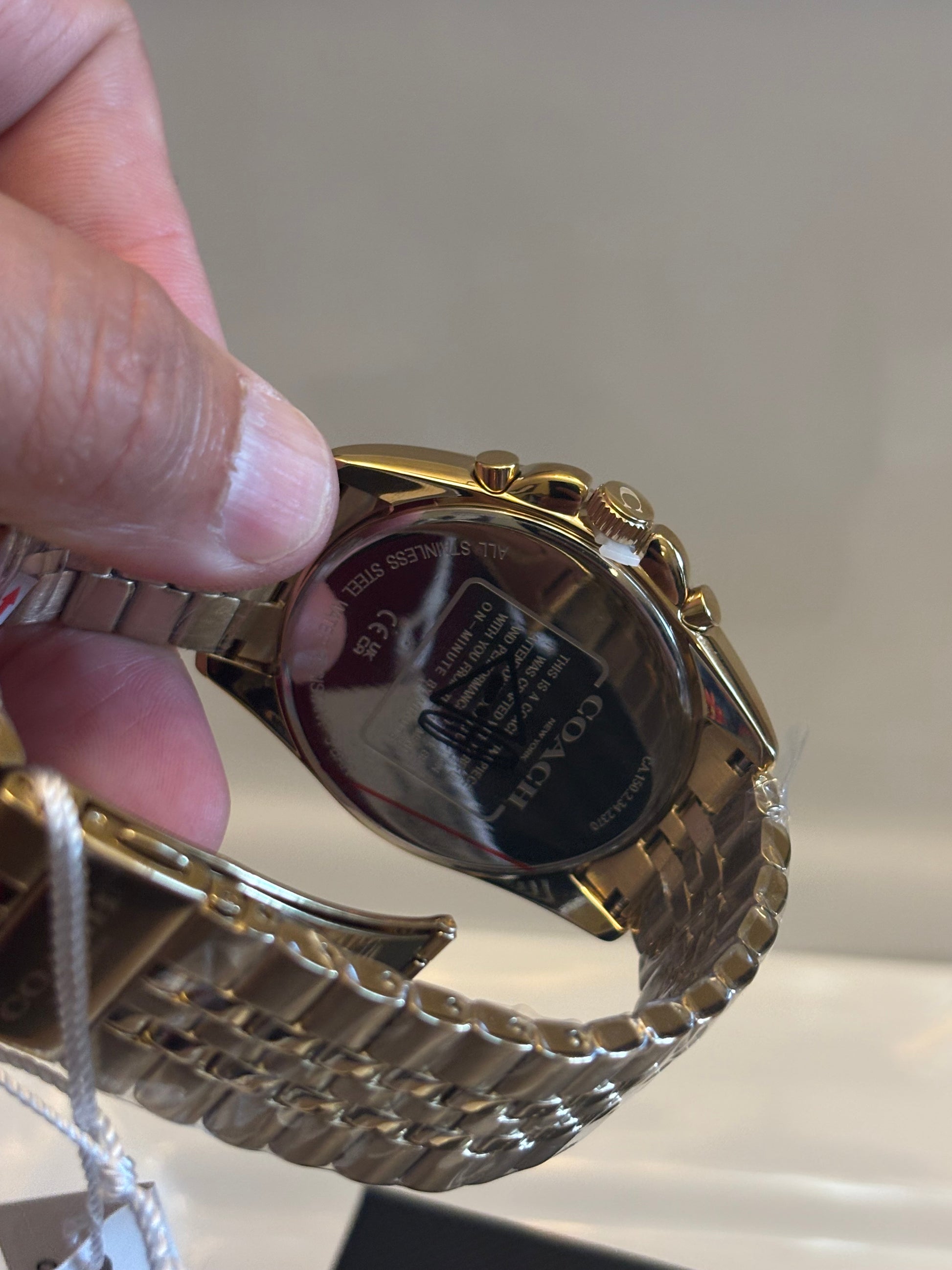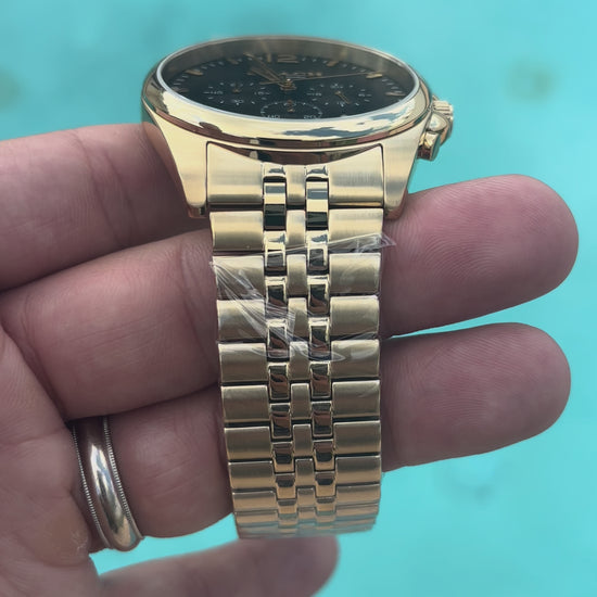 - Bracelet: Matching gold-tone stainless steel with fold-over clasp