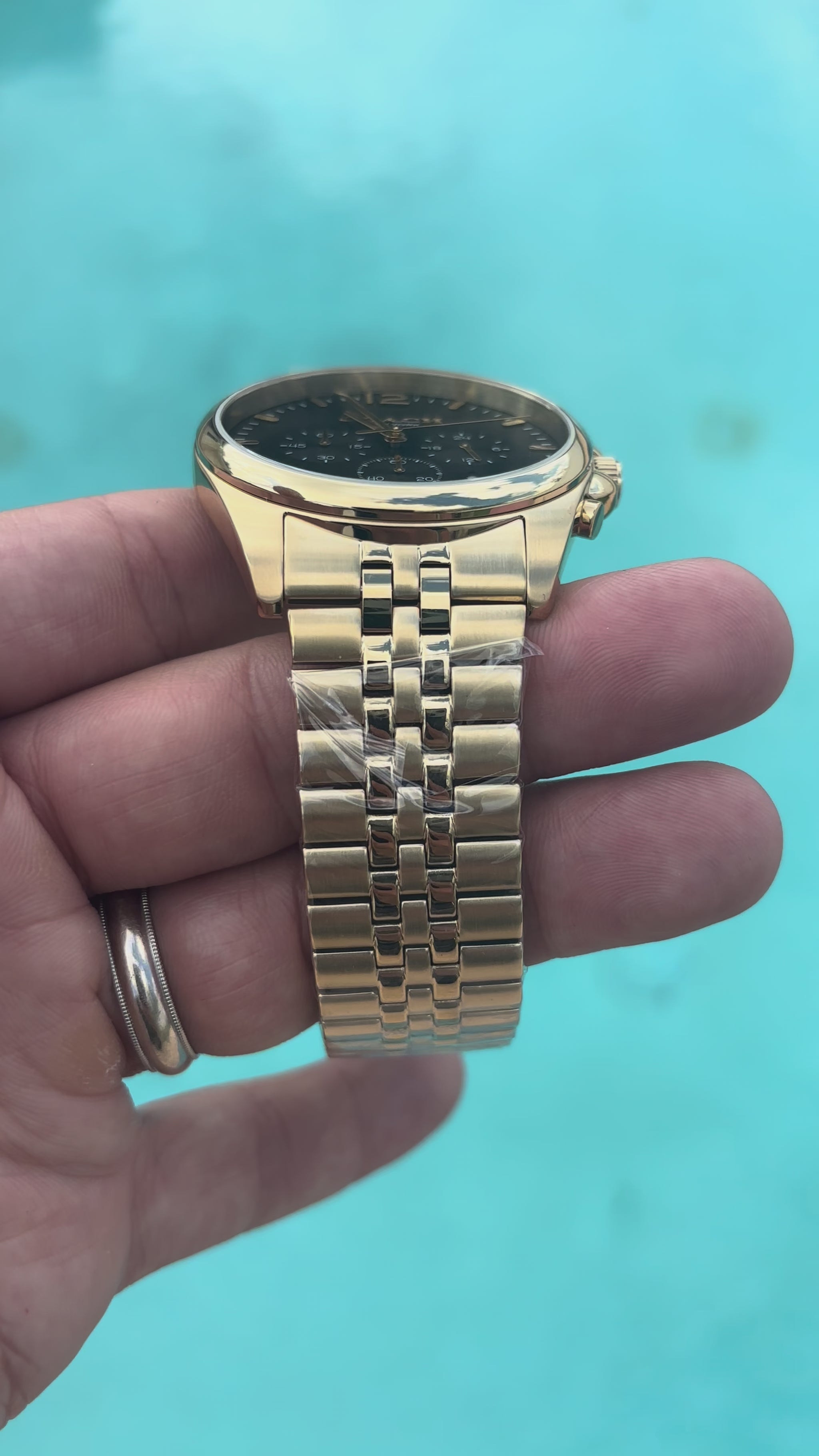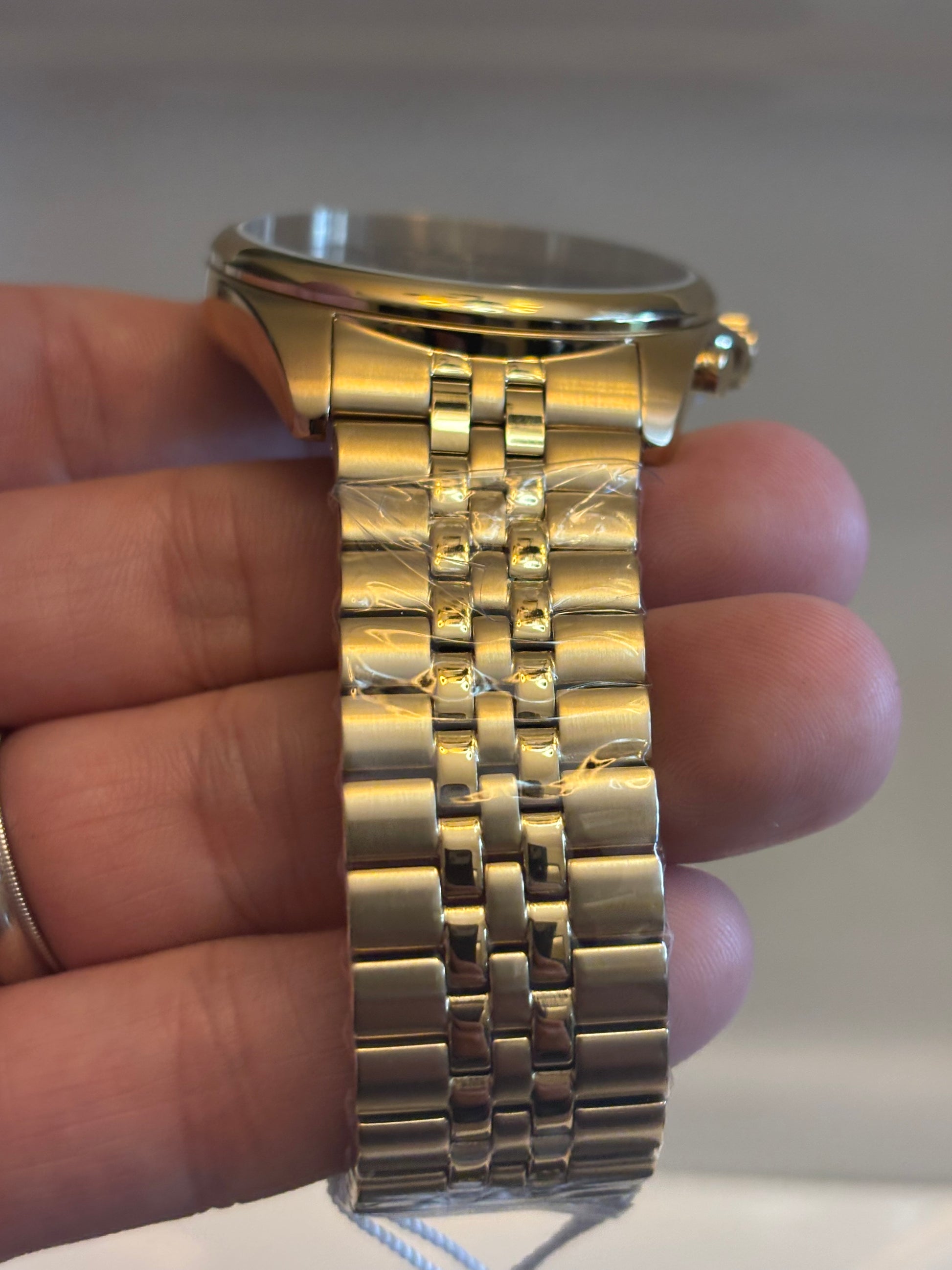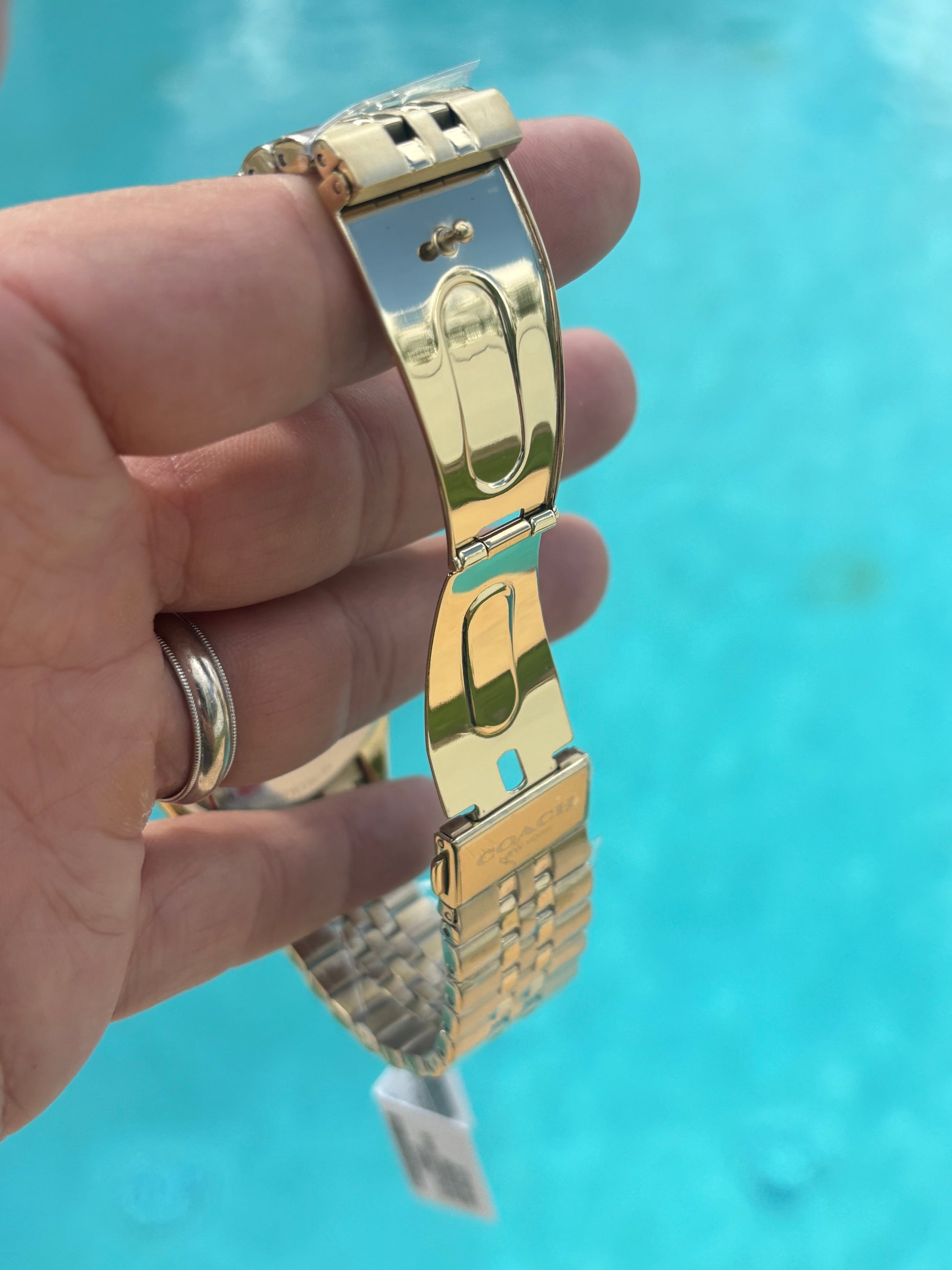 - Bracelet: Matching gold-tone stainless steel with fold-over clasp