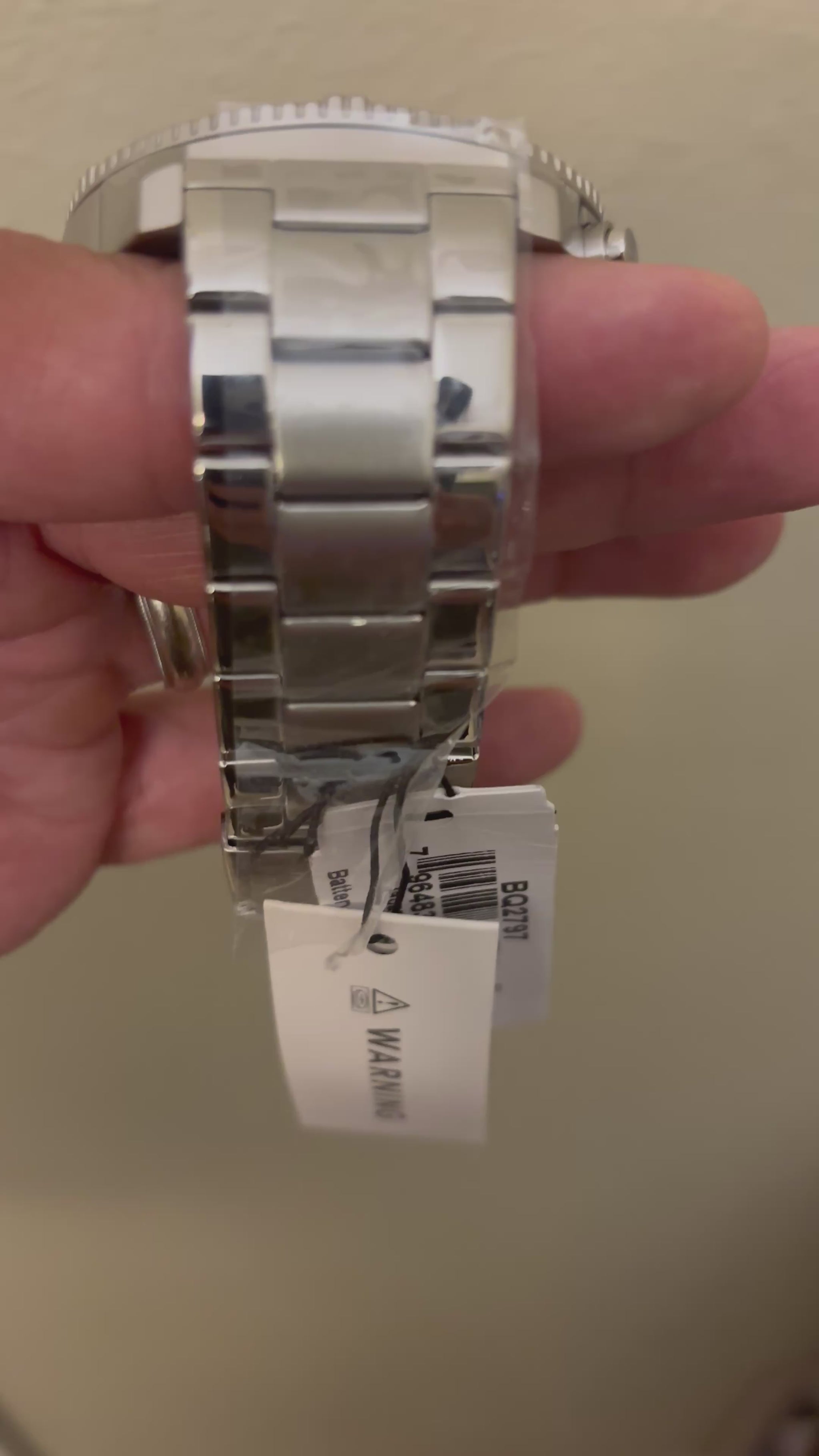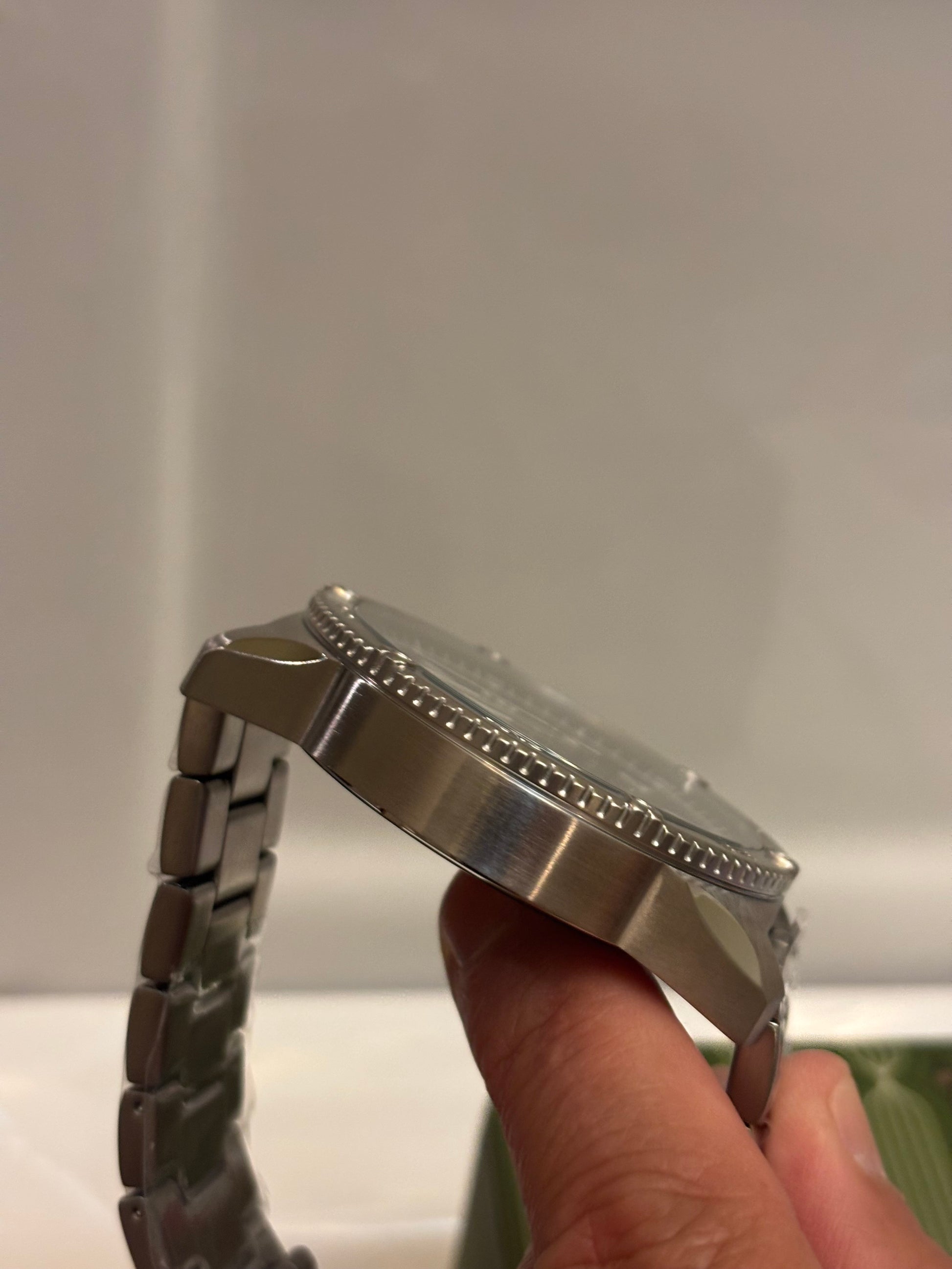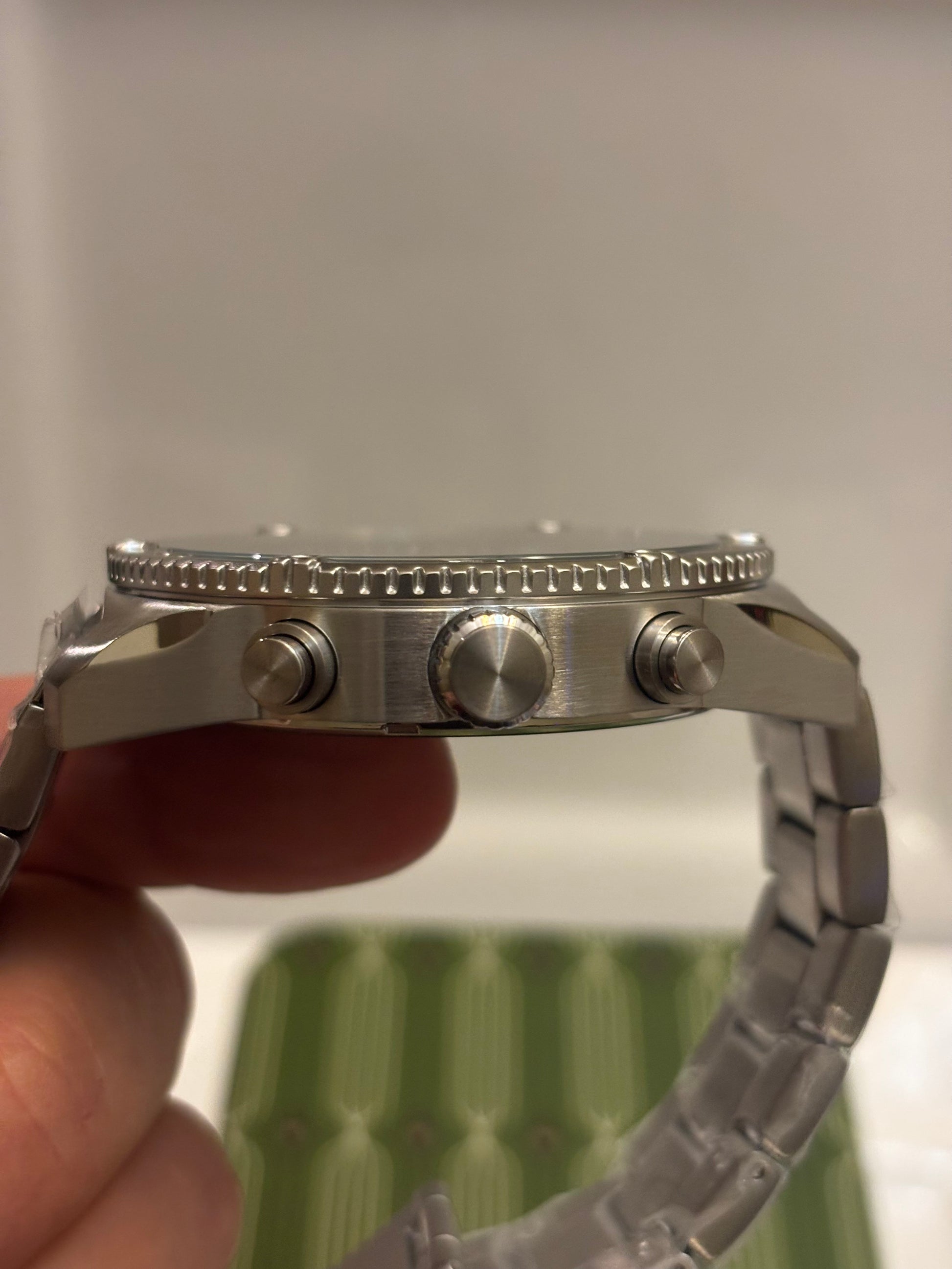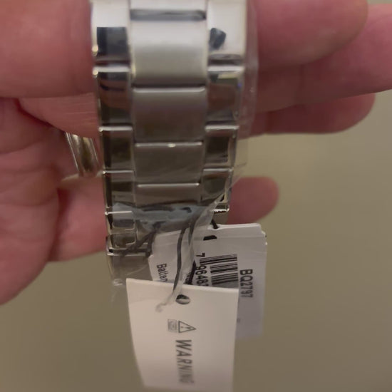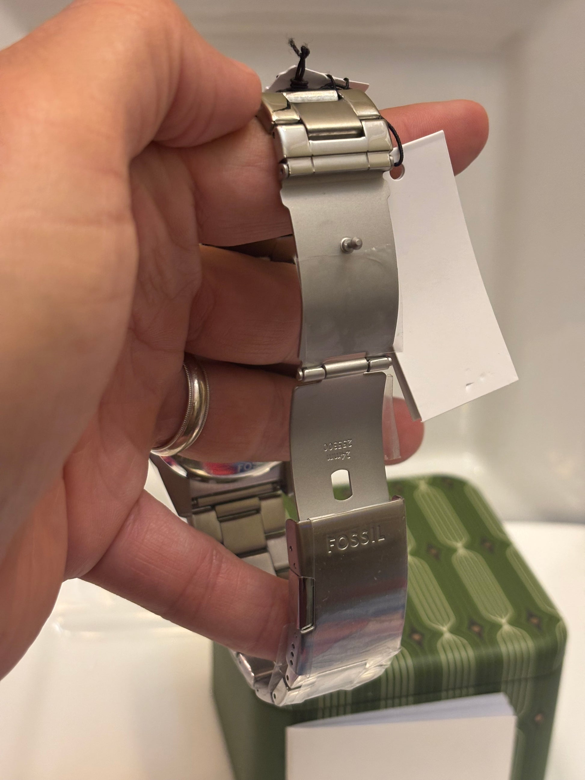 - Bracelet: Stainless steel, 24mm width, fold-over clasp with push-button release