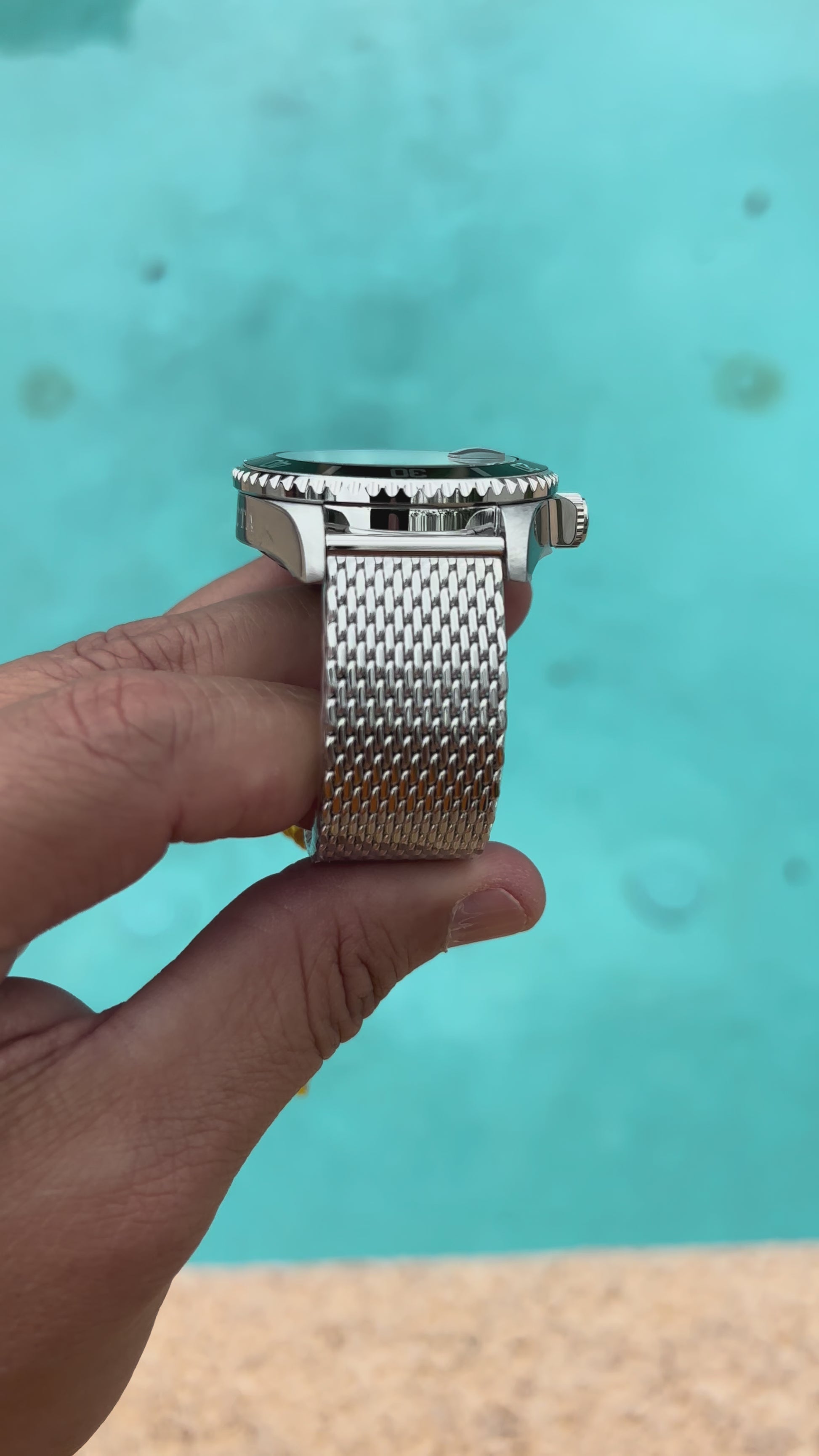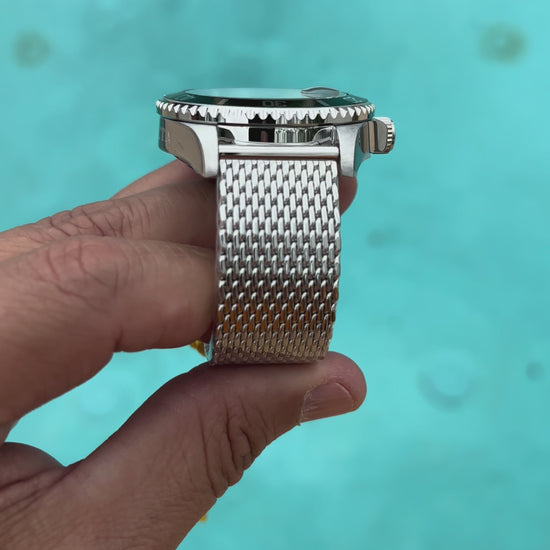 - Bezel: Unidirectional aluminum diver bezel (black/green/silver tones)