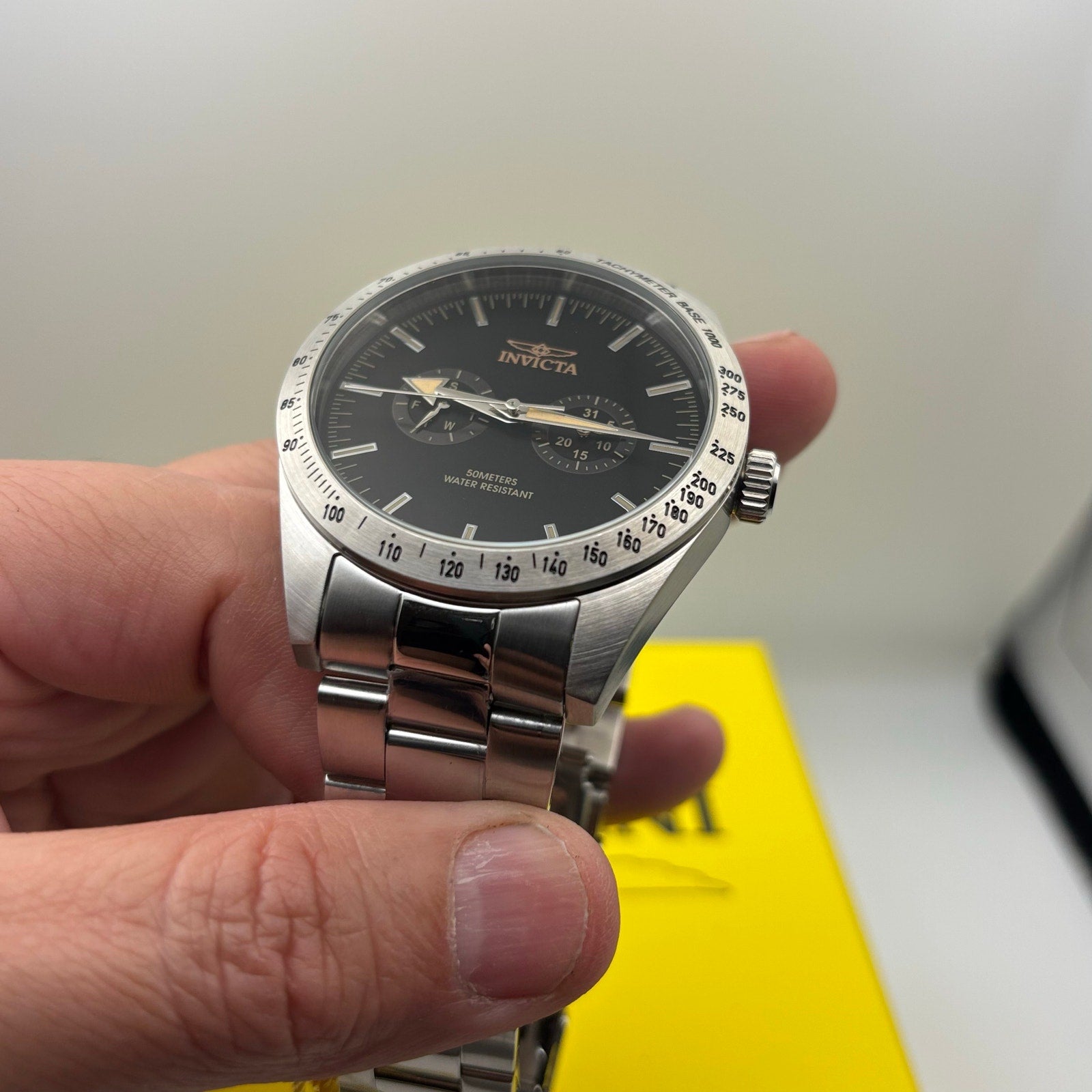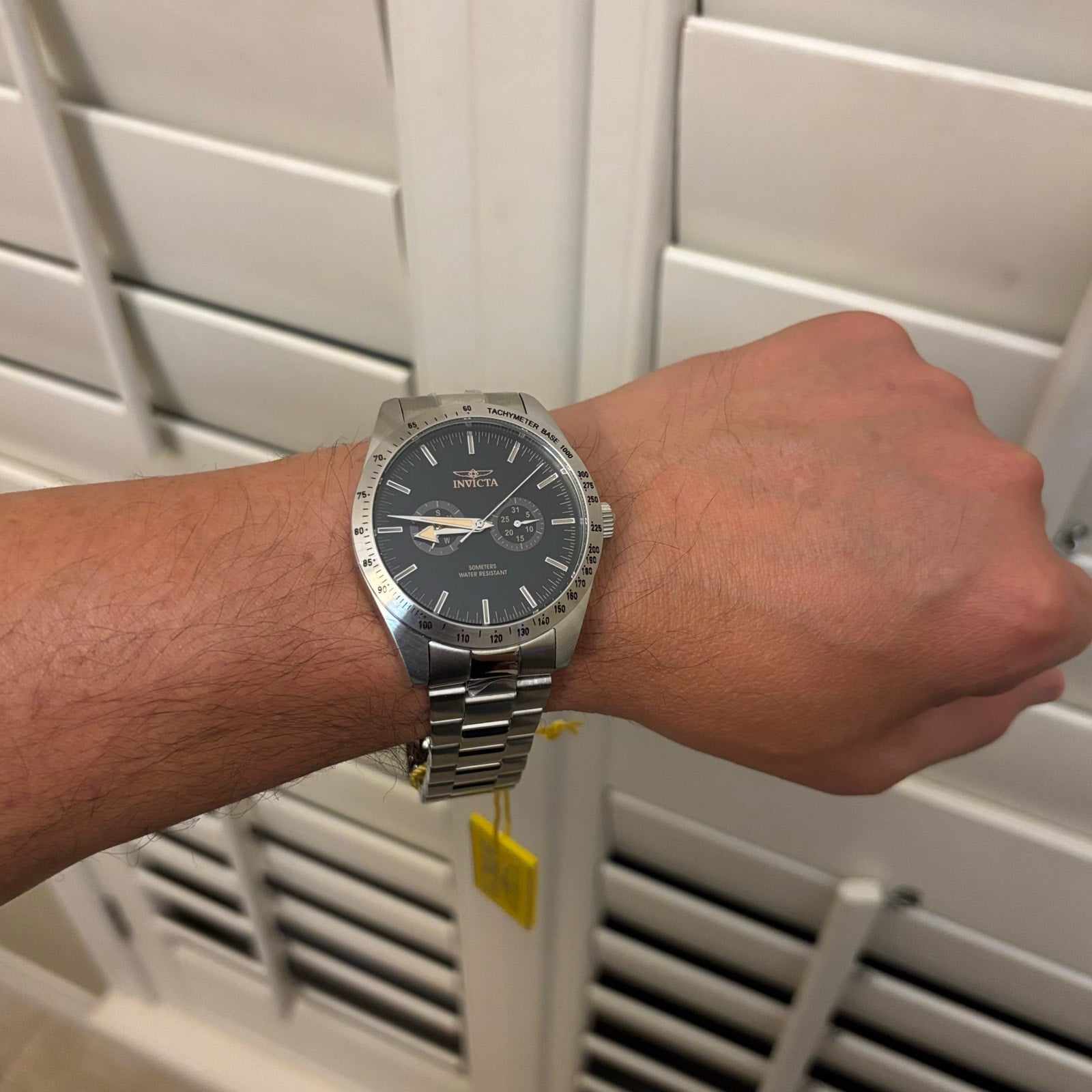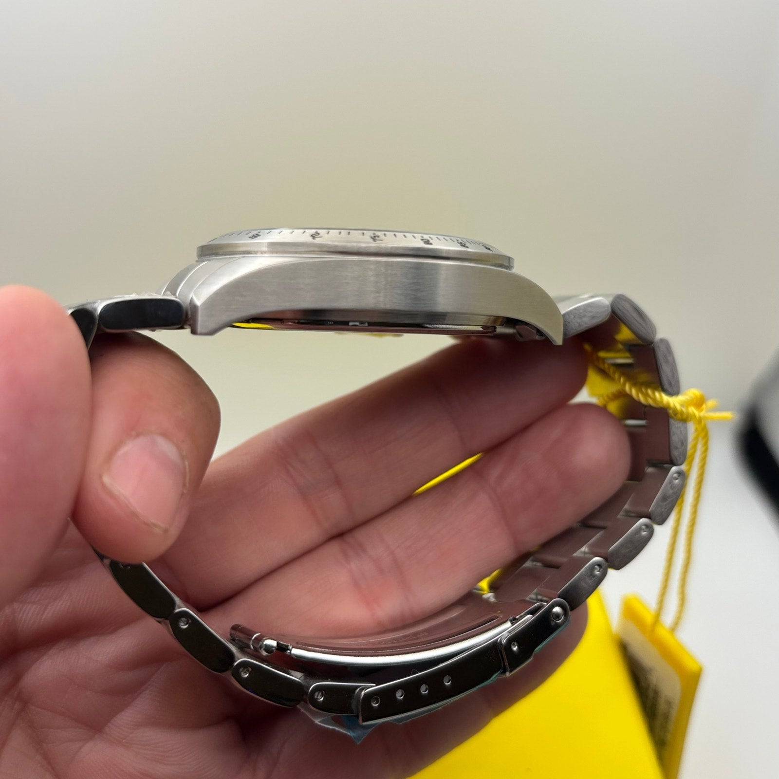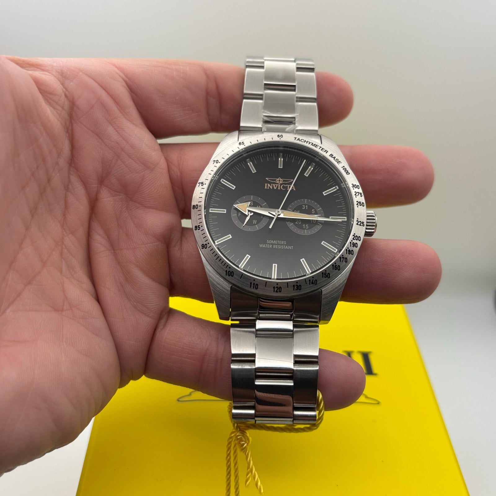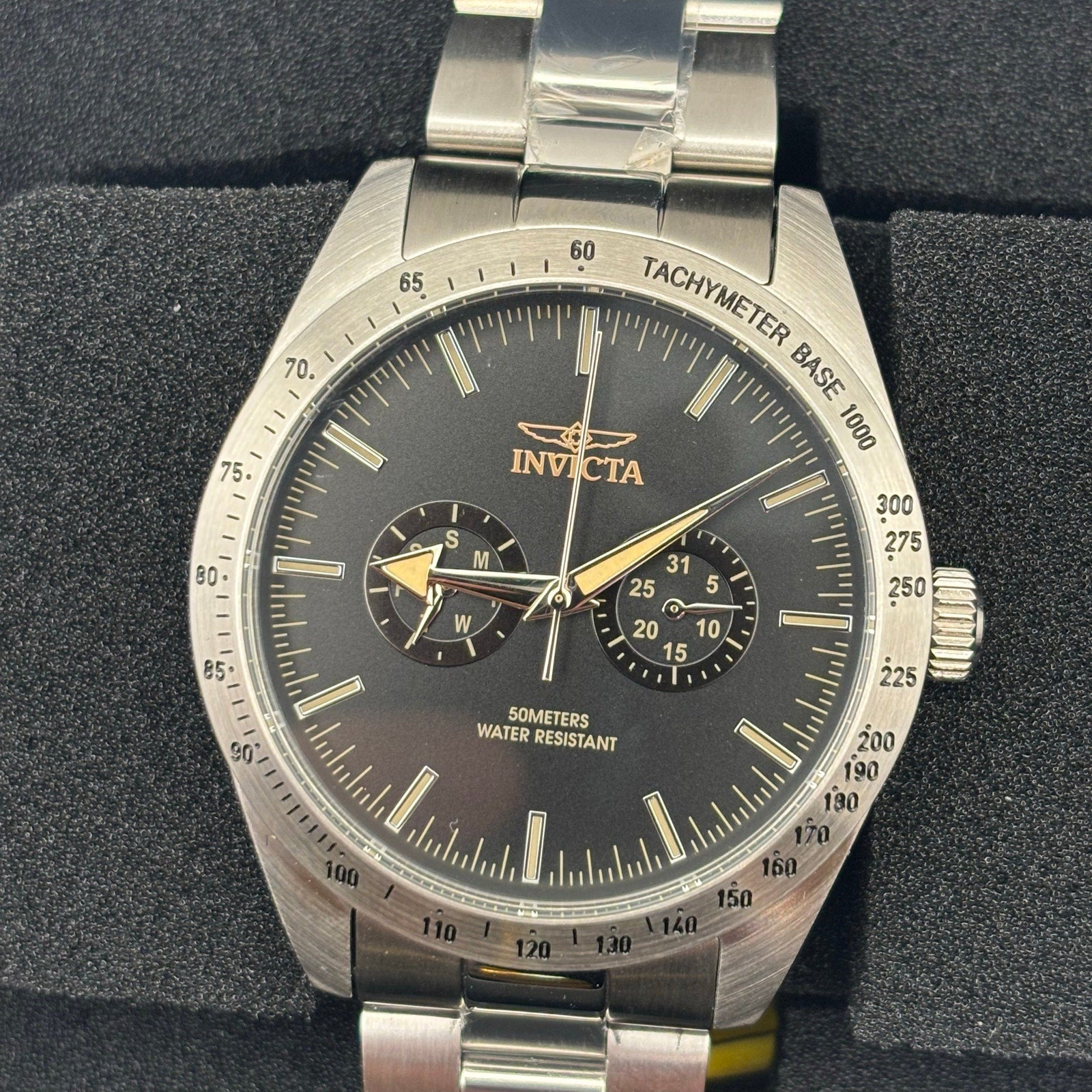 Clean steel with everyday utility. The Invicta Specialty 45971 pairs a 44 mm stainless-steel case and bracelet with a black dial featuring day and date sub-dials, a fixed tachymeter bezel, and Flame Fusion crystal for durability. Powered by a reliable quartz movement (TMI VH64) and rated to 50 m water resistance, it’s an easy daily wear that still looks sharp. New with tags and Invicta packaging.