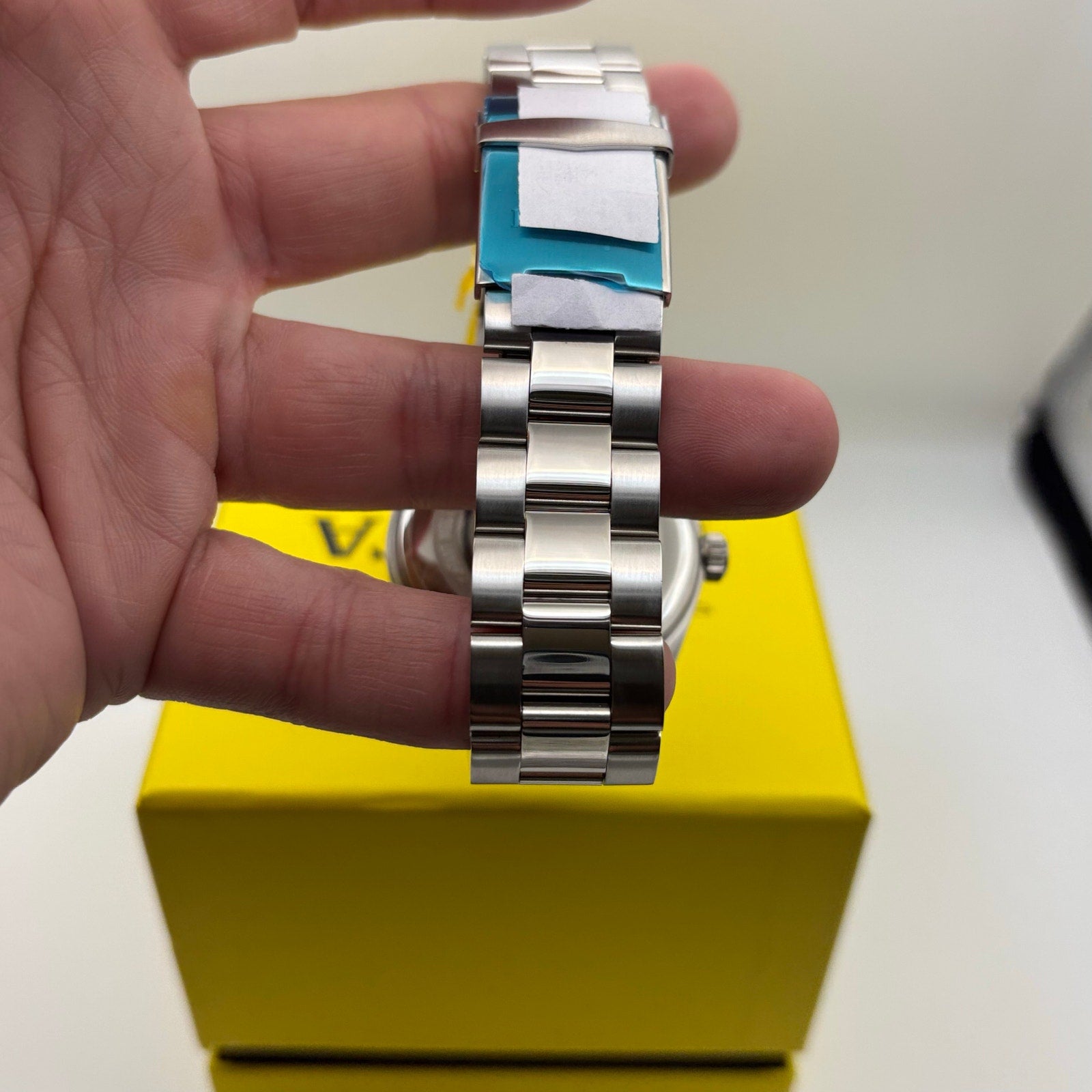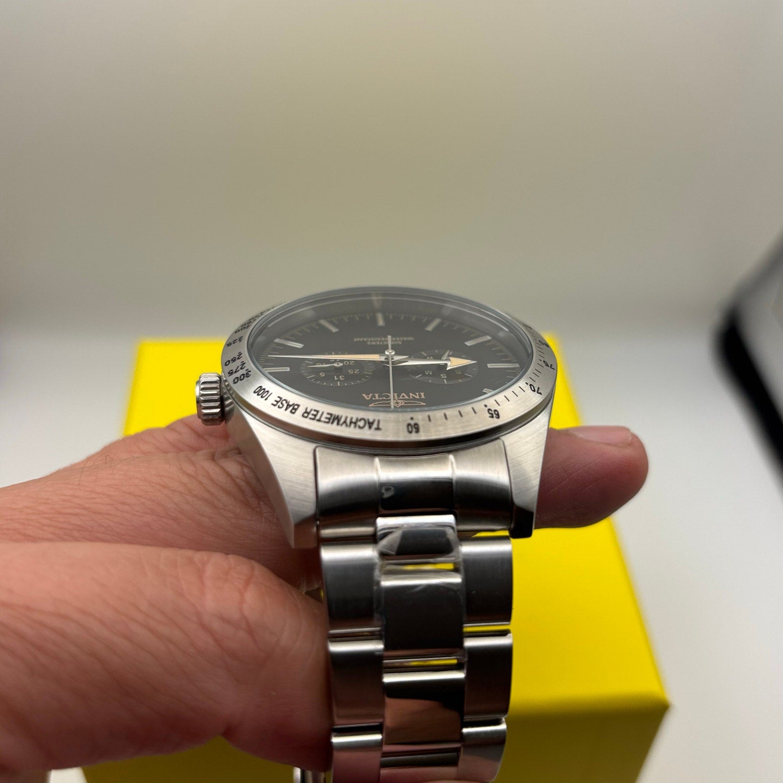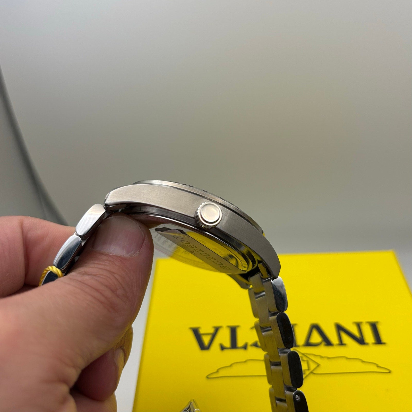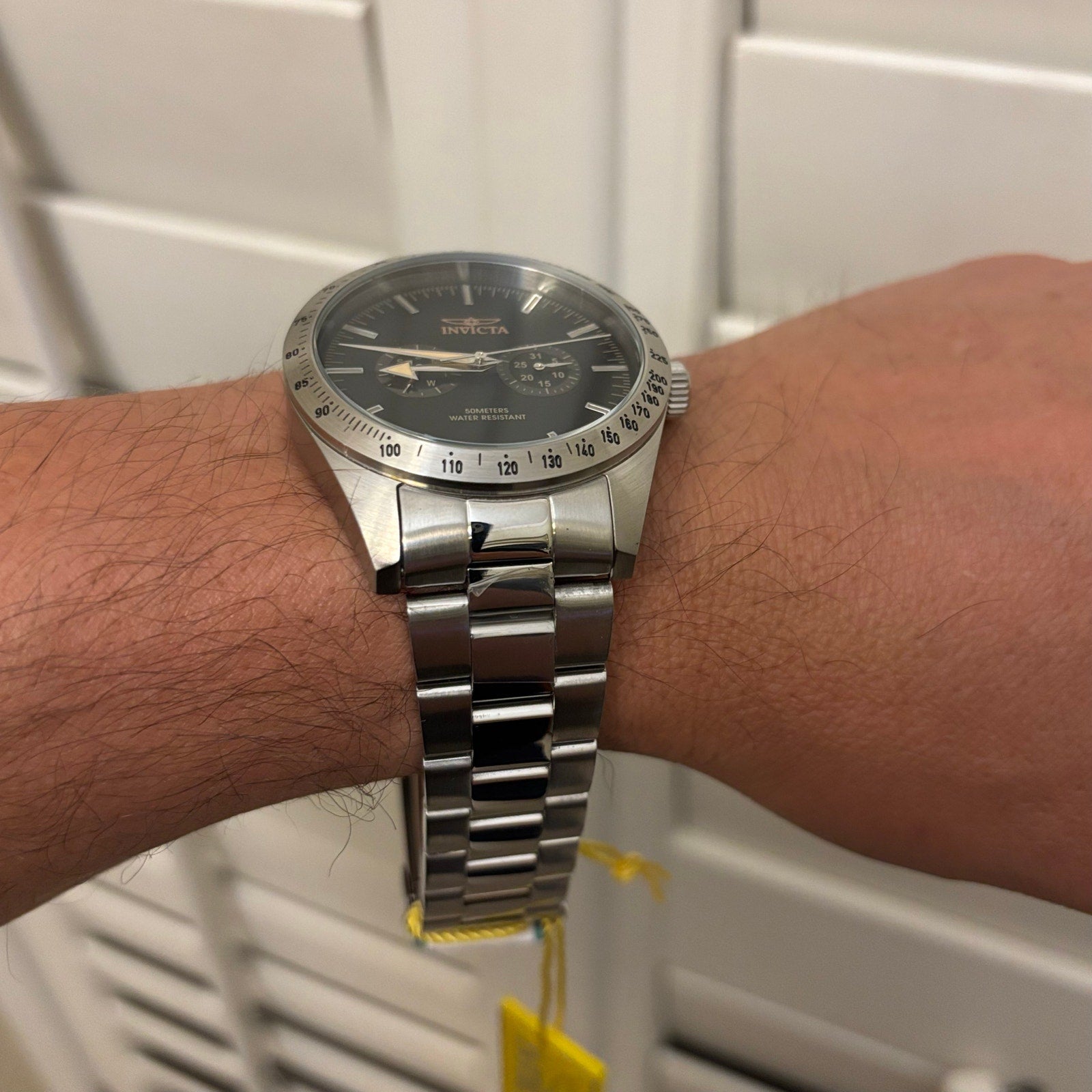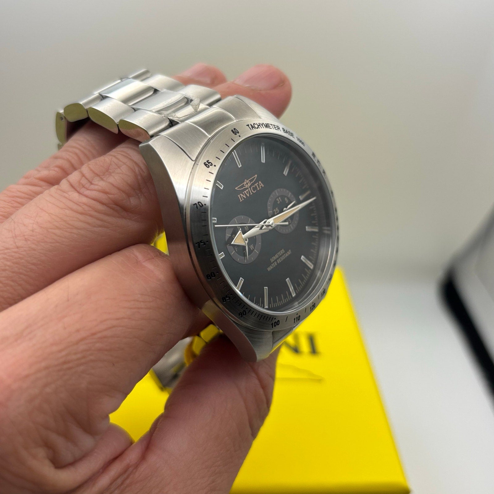 Clean steel with everyday utility. The Invicta Specialty 45971 pairs a 44 mm stainless-steel case and bracelet with a black dial featuring day and date sub-dials, a fixed tachymeter bezel, and Flame Fusion crystal for durability. Powered by a reliable quartz movement (TMI VH64) and rated to 50 m water resistance, it’s an easy daily wear that still looks sharp. New with tags and Invicta packaging.
