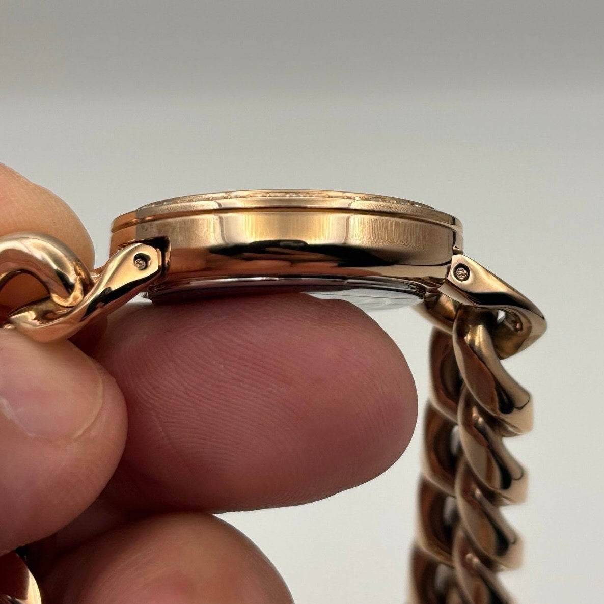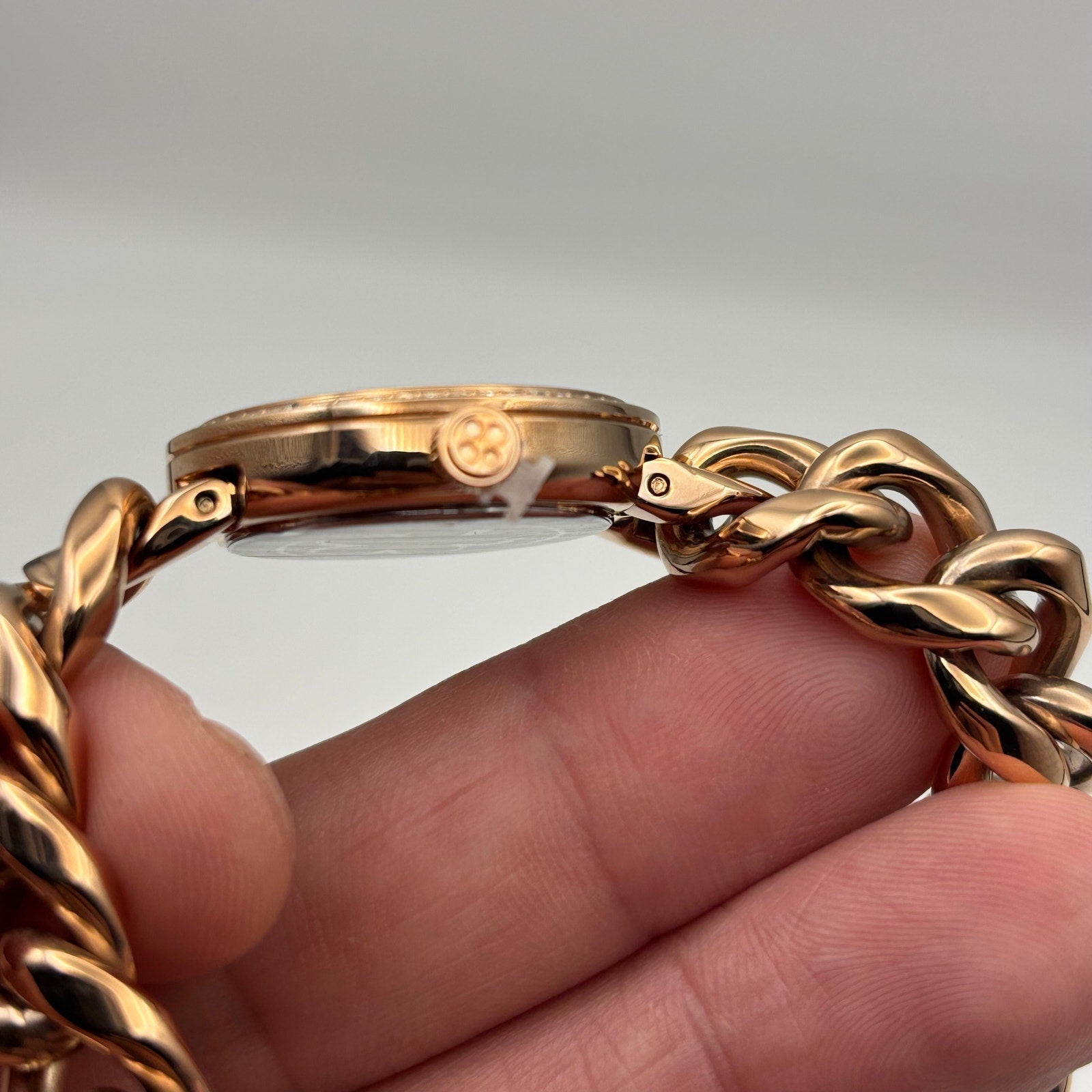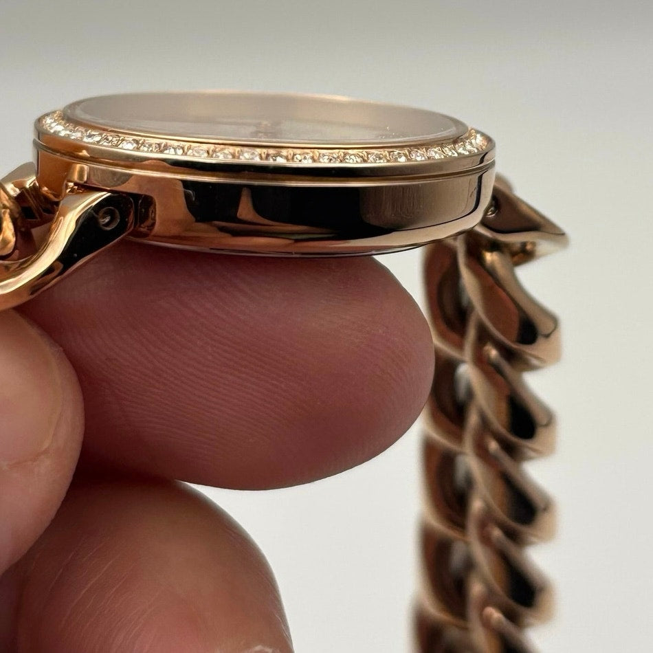 Details: 28 mm case, quartz movement, mineral crystal, 50 m WR, rose-gold-tone stainless bracelet, fold-over clasp. New with tags and box.